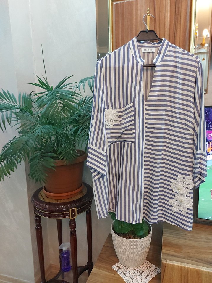 Uzun kollu, V yakalı ve düğmeli kadın gömleği. Mavi ve beyaz çizgili dokuma kumaş üzerine nakışlı çiçek detayları bulunur. Salaş kesim ve Tunik boyda, rahat sokak stili için uygun.