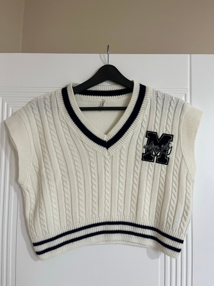 V yaka ve nakış detaylı, örgü kumaştan yapılmış, salaş kesim süveter. Etek ve yaka kısmında çizgili ribana bulunur. 9-10 yaş ve 134-140 cm.