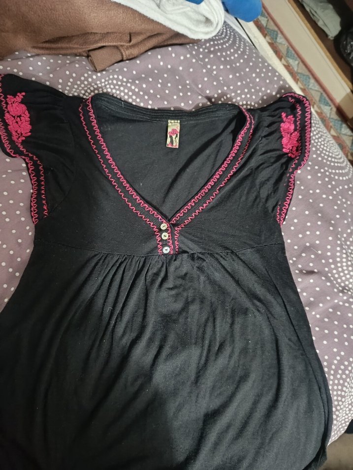 Düğmeli, V yaka ve kısa kollu , koyu pembe nakış detaylarıyla midi boyda. Yumuşak tekstil kumaştan, günlük kullanıma uygun bohem tarzda triko.