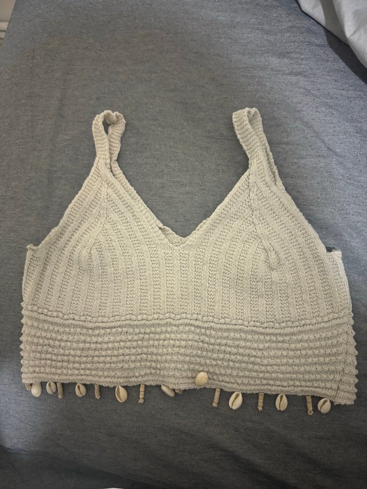 V yaka ve ince askılı, örgü bej renkli, kabuk detaylı, bohem tarzda rahat ve vücuda oturan büstiyer.