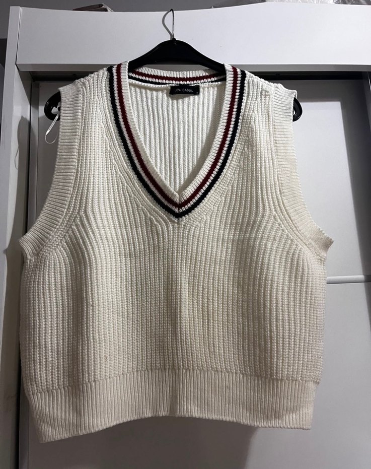 V yaka, çizgili detaylı beyaz örgü, bol kesim, kolsuz süveter, rahat sokak stili için uygundur.