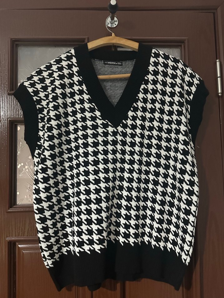 V yaka, kolsuz ve bol kesimli siyah beyaz örgü kaz ayağı desenli Eni 58 boyu 65 cm