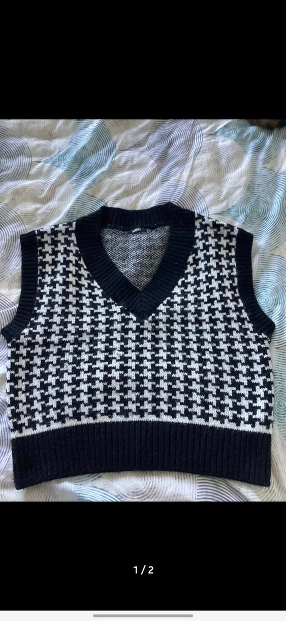 V yaka, örgü, kolsuz ve bol kesim kadın süveter. Siyah beyaz klasik desenli, günlük rahat sokak stili için uygundur.