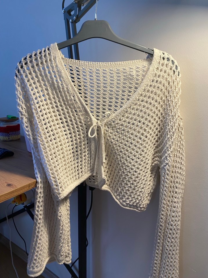 Bu beyaz örgü kadın hırka, bol kesim, uzun kollu ve V yaka detayına sahiptir. Örgü dokusu hafif ve hava geçirgendir, bohem tarzına uygundur. Önde bağlama detayı ve midi boydadır.