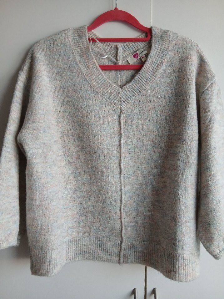 V yakalı ve bol kesim örgü kadın kazak, rahat ve günlük kullanım için uygundur. (renk renk parlak küçük iplikleri var. sağ alt tarafta ip kaçması vardı ama o kısım dikilmiş durumda. göze batacak bir yerde değil merak etmeyin. resimlerde o kısmı göstermeye çalıştım. kolu tam bileğe kadar gelmiyor daha kısa yani.)