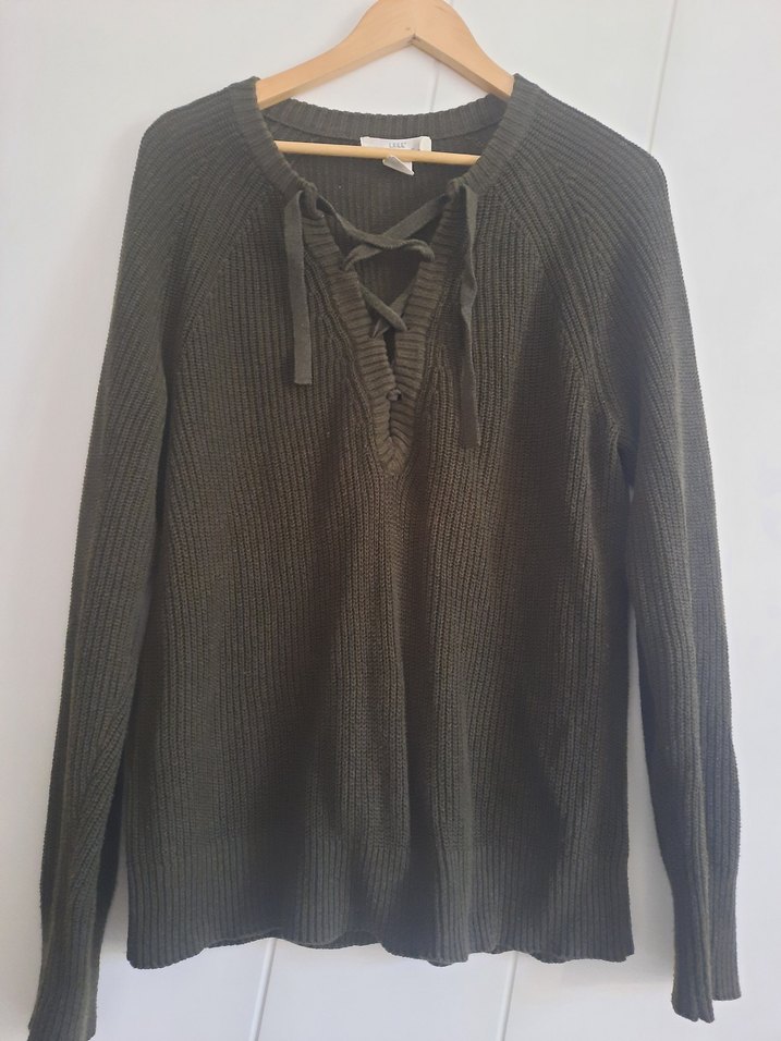 V yaka ve bağcıklı detaylı örgü kadın kazak. Uzun kollu, salaş kesim ve midi boyda, günlük kullanıma uygun.