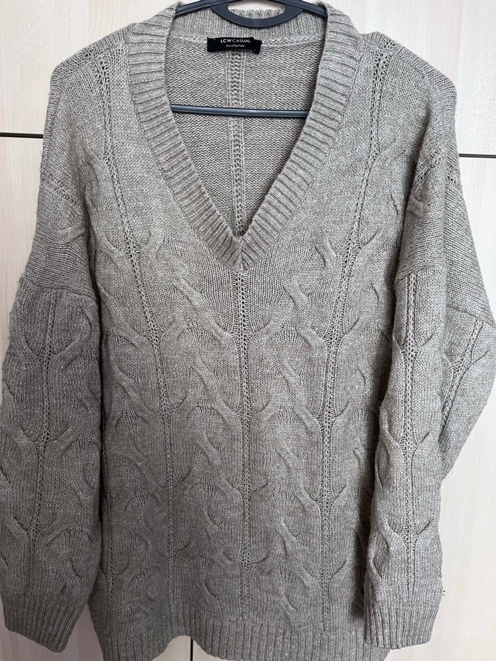 , V yaka ve uzun kollu örgü kadın kazak. Rahat ve bol kesim, günlük kullanıma uygun midi bo