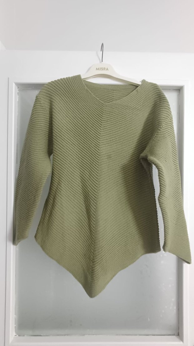 V Yaka Örgü Kadın Kazak - Haki