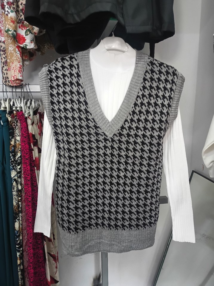Renkli, V yaka, örgü dokuma ve kolsuz kadın süveter. Salaş kesimi ve midi boyuyla günlük sokak stiline uygundur. Rahat ve sıcak bir görünüm sunar.