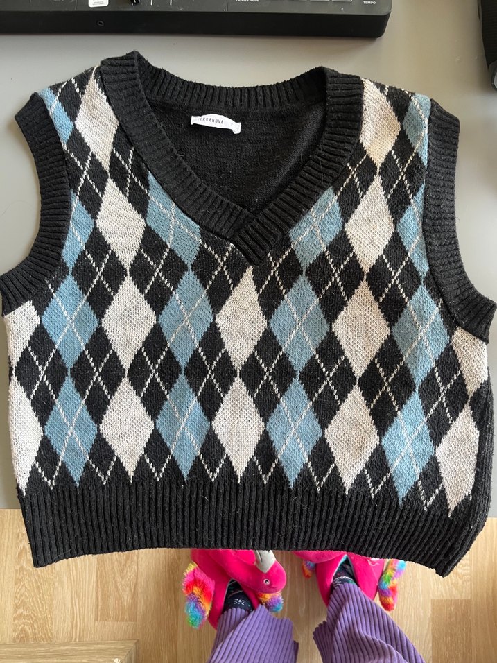 V yaka, kolsuz ve örgü dokuda, fitted kesim kadın süveter. Koyu tonlarda çok renkli karo desenli, midi boy, rahat sokak tarzı için uygun. S beden diyor ama çok bol kalıp . L gibi düşünün