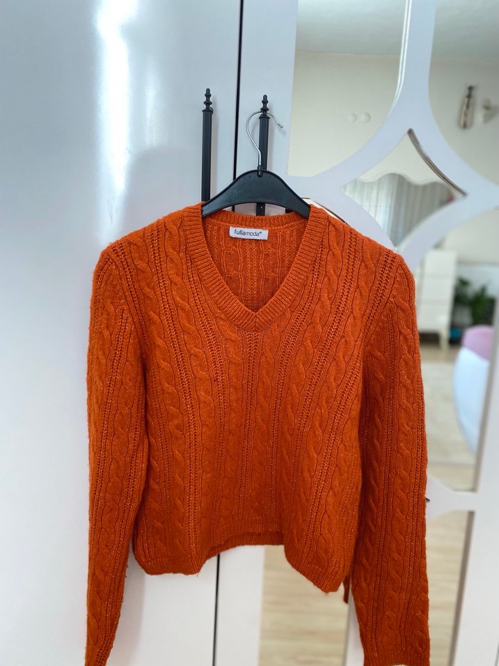 Bu kahverengi örgü kazak, V yakalı ve uzun kolludur. Rahat kesimi ve normal uzunluğuyla günlük kullanıma uygundur. Defosuz