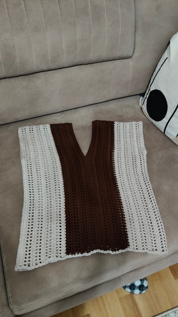 V yaka, örgü kahverengi ve gri tonlarında, rahat kesim, kolsuz kadın süveter. Günlük kullanıma uygun bohem tarzda, konforlu bir parça.