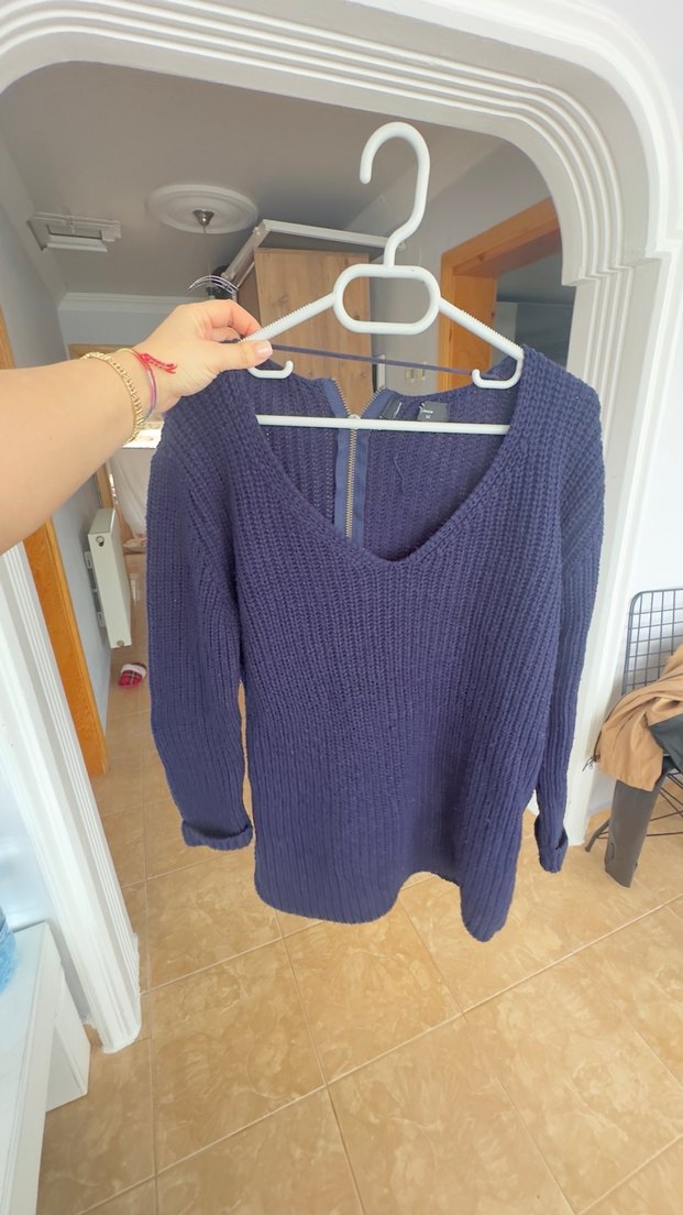 V yaka, uzun kollu, örgü mavi kazak. Rahat kesimi ve midi boyu ile günlük kullanıma uygun, sade ve konforlu bir model.