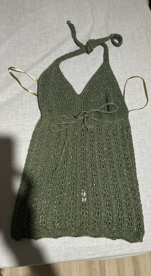 Yeşil renkli, V yakalı ve askılı kolları olan, vücuda oturan örgü midi elbisedir. Bohem tarzda, günlük kullanıma uygundur.