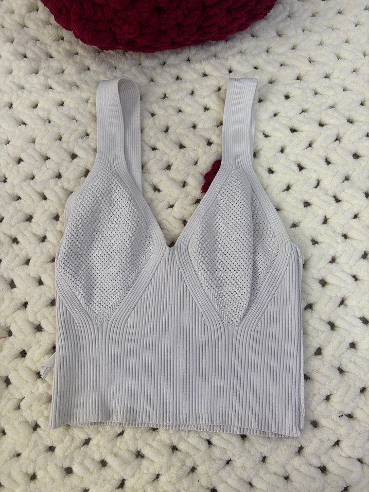 Beyaz renkli, örgü kumaştan yapılmış, V yakalı, kısa ve dar kesim kadın atleti. Sokak stili için uygun, rahat ve şık bir parça.