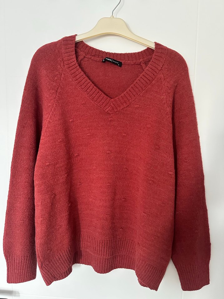 Kiremit renkli, V yaka ve uzun kollu örgü kazak. Salaş kesimi ve bohem tarzıyla günlük kullanıma uygun, rahat bir parçadır.