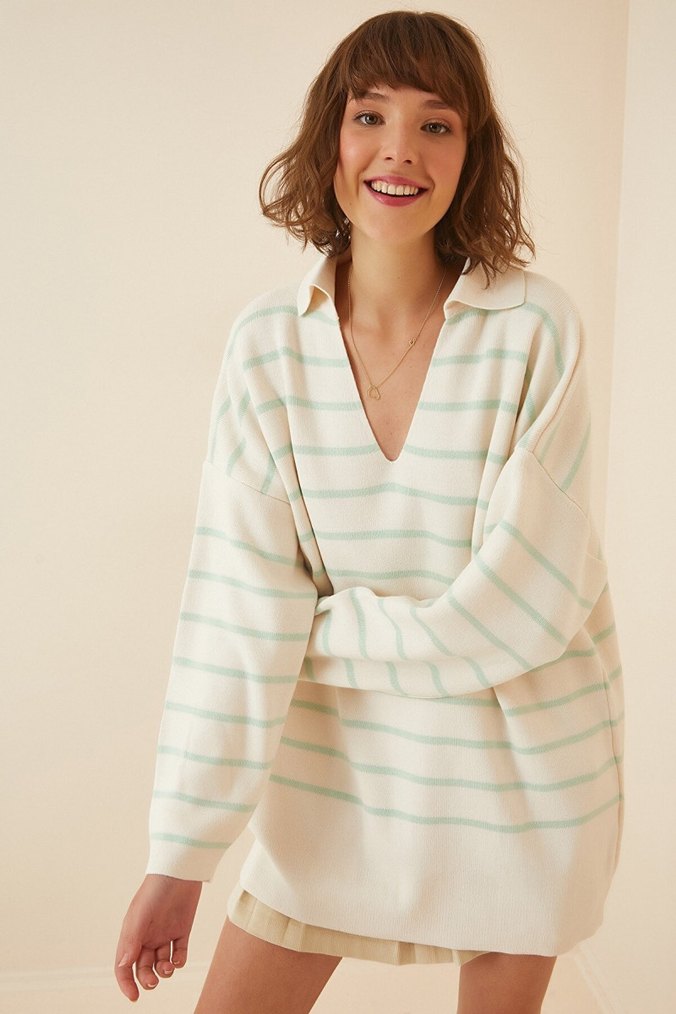 V yakalı, uzun kollu, pamuklu ve çizgili örme kazak. Rahat kesimi ve midi boyu ile günlük kullanıma uygundur.