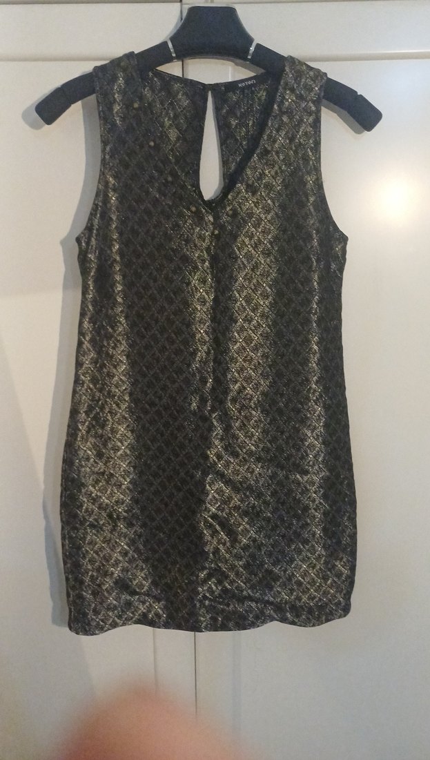Metal zımbalı, desenli,parlak v yakalı, kolsuz, fitted kesim elbise. Romantik şık akşamlar için uygun. Xs ve s beden uygun kumaş esnek değil.
