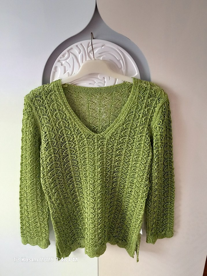 Yeşil renkli, V yakalı ve uzun kollu örme kazak. Salaş kesimi ve sade deseniyle rahat ve bohem tarzda günlük kullanıma uygundur.