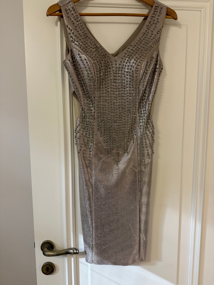 V yaka, kolsuz, vücuda oturan bu uzun gece elbisesi, bej ve gri tonlarında payetli yılan desenine sahiptir. Parlak ve şık bir parti görünümü sunar. ✨ürün hiç kullanılmadı . Yanlarındaki file detayı çok güzel hava vermektedir