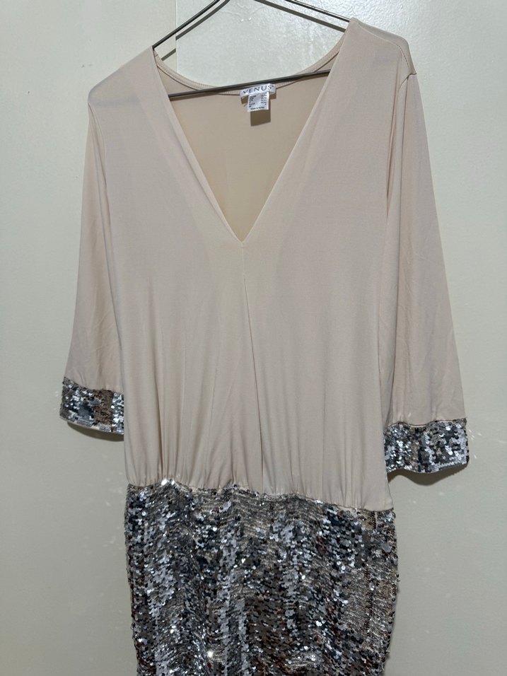 Bej renkli, V yakalı . Kol ve etek uçlarında payet detayları vardır, jarse kumaş olup elastik yapıdadır✨