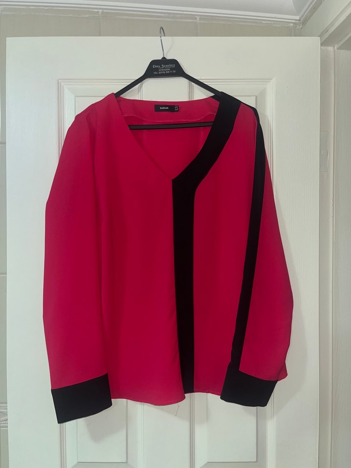 Fuşya V yakalı, uzun kollu ve drapeli detaylara sahip kadın bluz. İpek gibi kumaştan, ofis için uygun, minimalist tarzda. SARAR marka hiç kullanılmadı