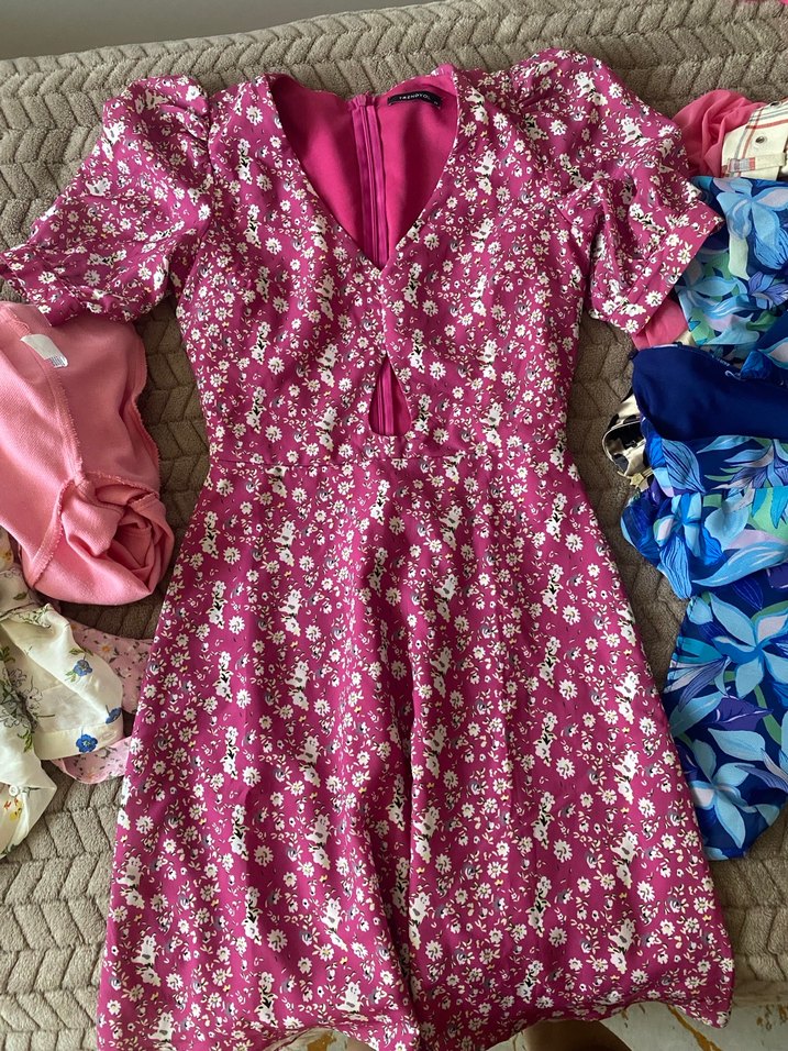 V yaka ve kısa kollu, pembe pastel çiçek desenli, dantel detaylı, bohem Paris tarzı dar kesim midi elbise.