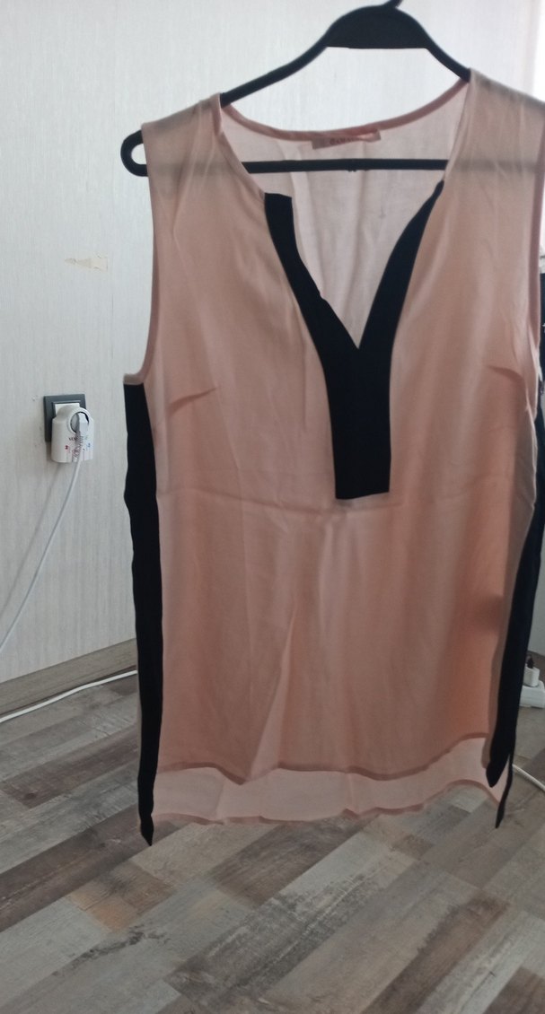 Pembe ve siyah renklerin kullanıldığı, V yakalı ve sıfır kol, bol kesim drapeli bluz. Günlük kullanıma uygun rahat bir sokak stili ürünü.