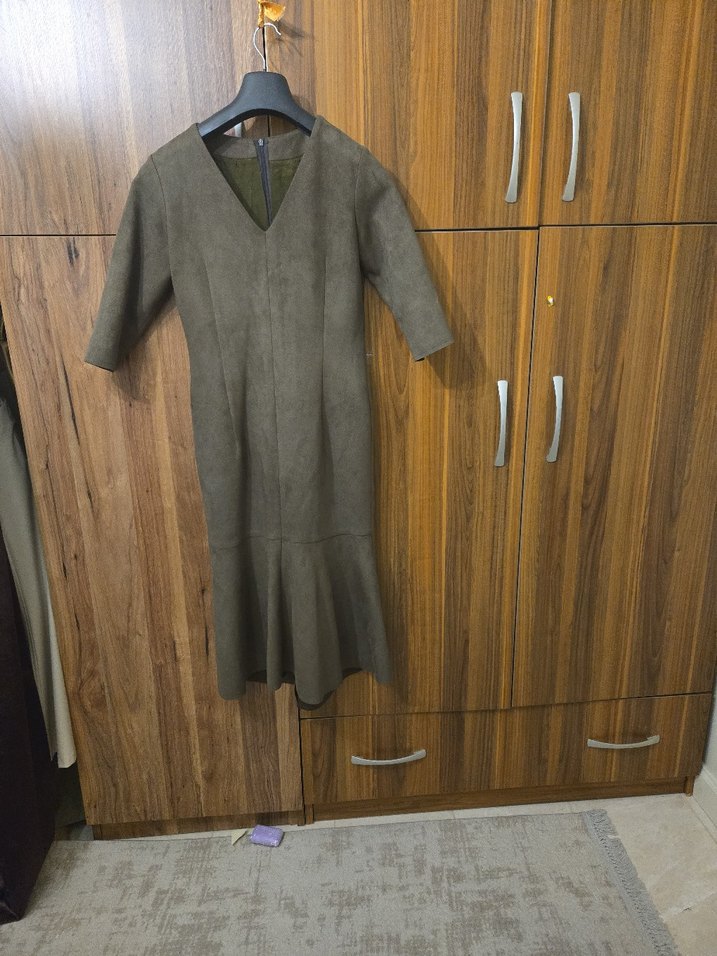 V Yaka Pile Detaylı Süet Elbise