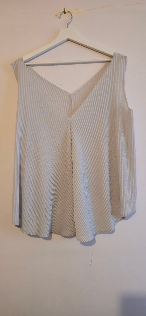 V yaka ve pileli tasarıma sahip kolsuz kadın bluz. Ucuk gri, bol kesim ve midi uzunlukta, çağdaş ve minimalist tarzda. Günlük kullanım için uygun.