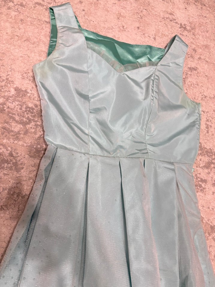 V yaka ve kolsuz, pileli detaylara sahip midi gece elbisesi.Bebek mavisi renkli parti için uygun.