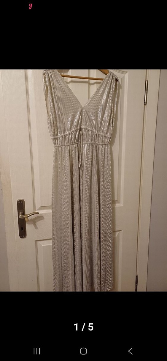 V yaka, pileli, kolsuz uzun bej elbise. Bol kesim ve bohem tarzıyla düğünler için uygun. kendinden parlak kumaş şık elbise ,göğüs kısmı bana açık geldiği için dikiş attırdım dilerseniz açtırıp kullanabilirsiniz, uçuş uçuş etekli...1 kez giyildi 42,44,46 bedene uygundur