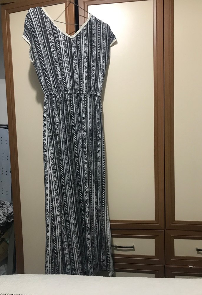 V yaka ve pile detaylı, uzun elbise. Gri tie-dye desenli, minimalist bohem tarzda, günlük kullanım için uygun. Soldan yırtmacı var. Ürünlerimde iade yoktur. #elbise #günlükelbise