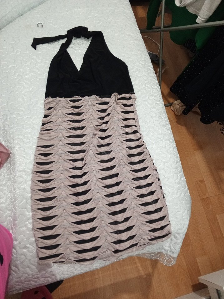 V Yaka Pileli Uzun Pembe Siyah Elbise