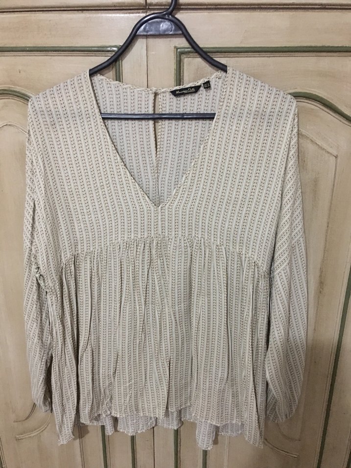 V yaka, uzun kollu, pilili ve pamuklu kumaştan yapılmış, bol kesim midi boyda bej kadın bluz