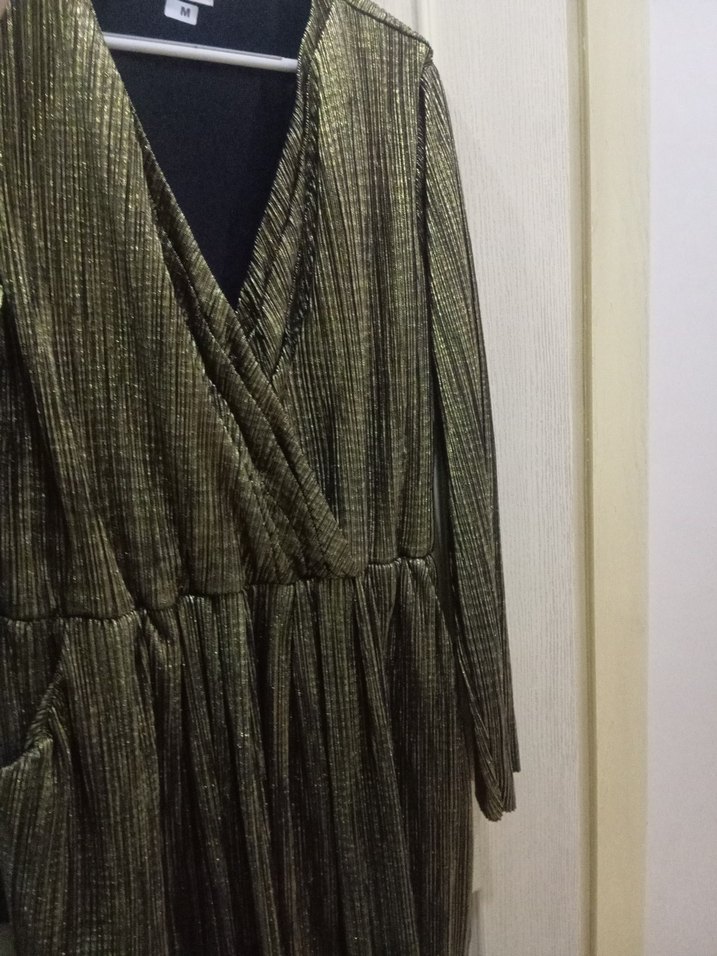 Bu gold kadın abiye elbise, parlak ve pilili tasarıma sahiptir. Bol kesim, uzun kollar ve V yaka ile parti için uygundur.✨