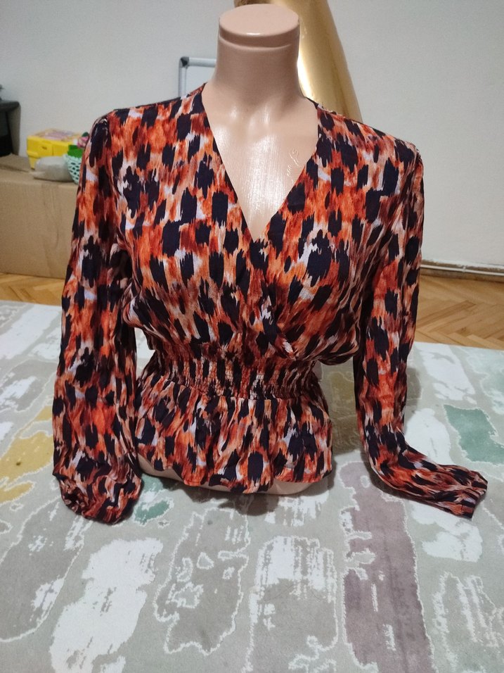 V yaka, uzun kollu, pilili, bol kesim, kısa boy kadın bluz. Canlı koyu çok renkli batik desenli, sentetik kumaş.