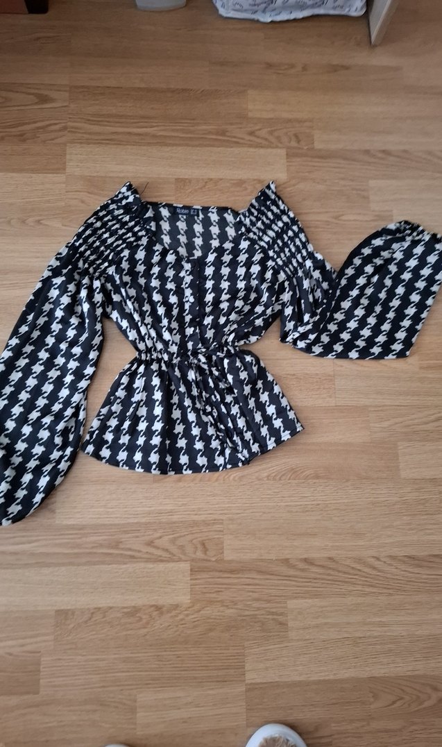 Uzun pilili kollu, V yakalı, bol kesim kısa boyda siyah ve gri bluz. Bağcıklı ve bağlama detaylı, trend sokak stili için uygundur.