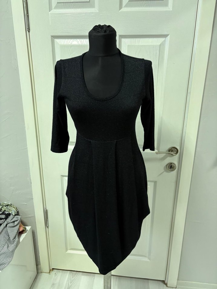 V Yaka Pilili Siyah Midi Elbise 36 bd
