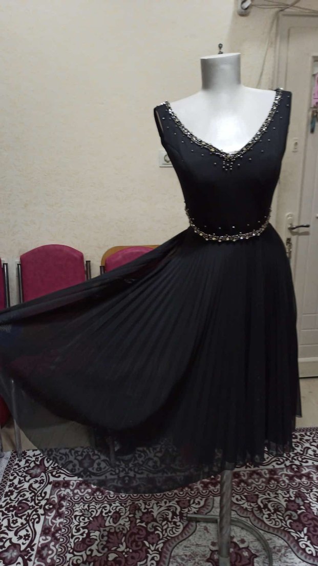 V yakalı, pilili etekli, beli ve yakası süslemeli siyah uzun abiye elbise, düğünler için uygun.