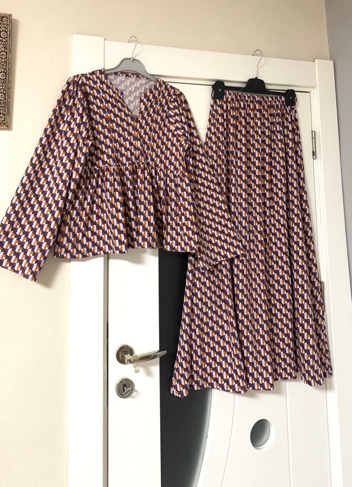 V yakalı, pilili tasarıma sahip bohem tarzda uzun kollu elbise. Koyu çok renkli deseni ve yumuşak sentetik kumaşı ile rahat ve bol kesim.