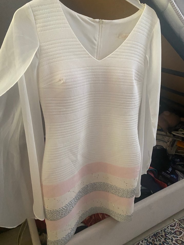 V yakalı, piliseli detaylı, uzun kollu ve midi boy beyaz triko elbise. Yumuşak sentetik kumaştan yapılmıştır, çağdaş ve Paris tarzına uygundur.