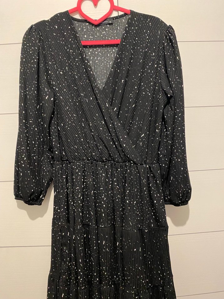 V yaka ve uzun kollu, piliseli siyah uzun elbise. Salaş kesimi ve ince desenleriyle romantik akşamlar için uygun.