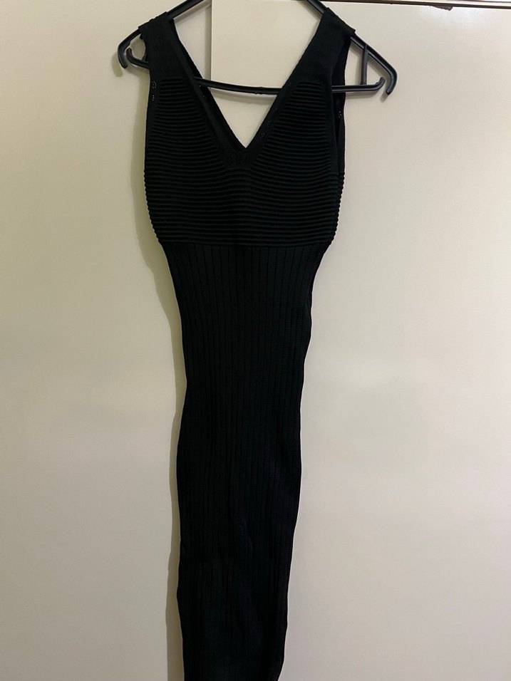 V yakalı, pliseli detaylara sahip siyah, dar kesim triko elbise. Askılı kollarıyla şık ve avangart bir görünüm sunar. Standart beden