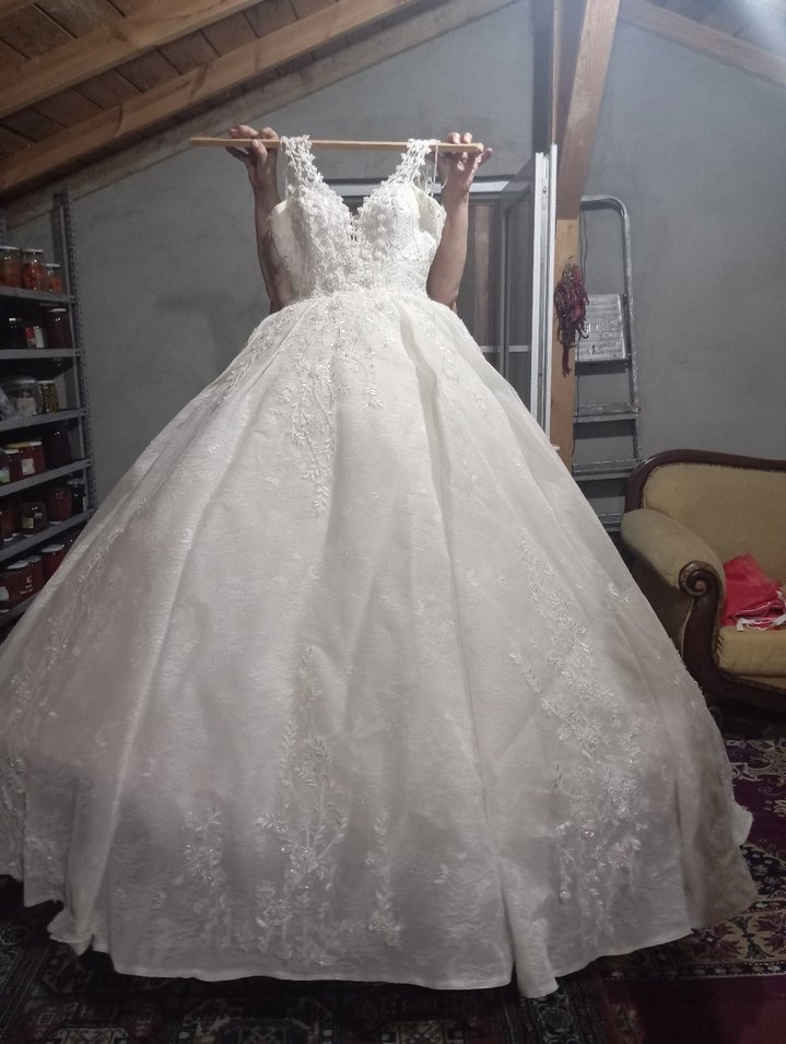 Parlak beyaz prenses gelinlik, V yaka ve kolsuz, vintage dantel detaylarla modern klasik tarzda, uzun ve vücuda oturan kesime sahiptir, 38 beden uyumlu, 1 defa kullanıldı, kuru temizleme yapıldı.