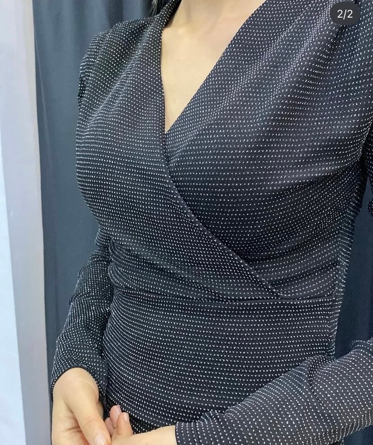 V yaka ve uzun kollu, ince kumaştan yapılmış, pileli detaylı puantiyeli gri kadın bluz, iş ortamları için uygundur. ✨