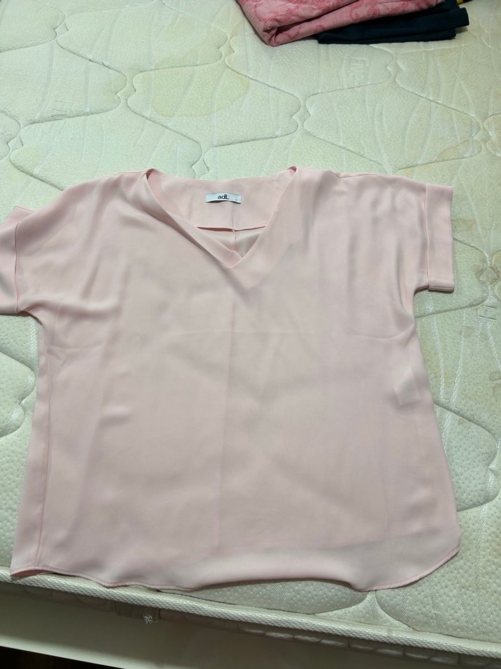 Pudra pembesi kısa kollu, V yakalı, midi boyda ve bol kesim bluz. Düz ve sentetik kumaştan, rahat ve şık bir görünüm sunar.