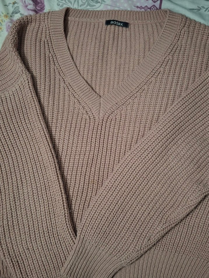 V yaka ve uzun kollu, bol kesim kadın kazak. Yumuşak örgüden üretilmiş, Pudra Pembe renkte ve desen içermeyen rahat bir modeldir.