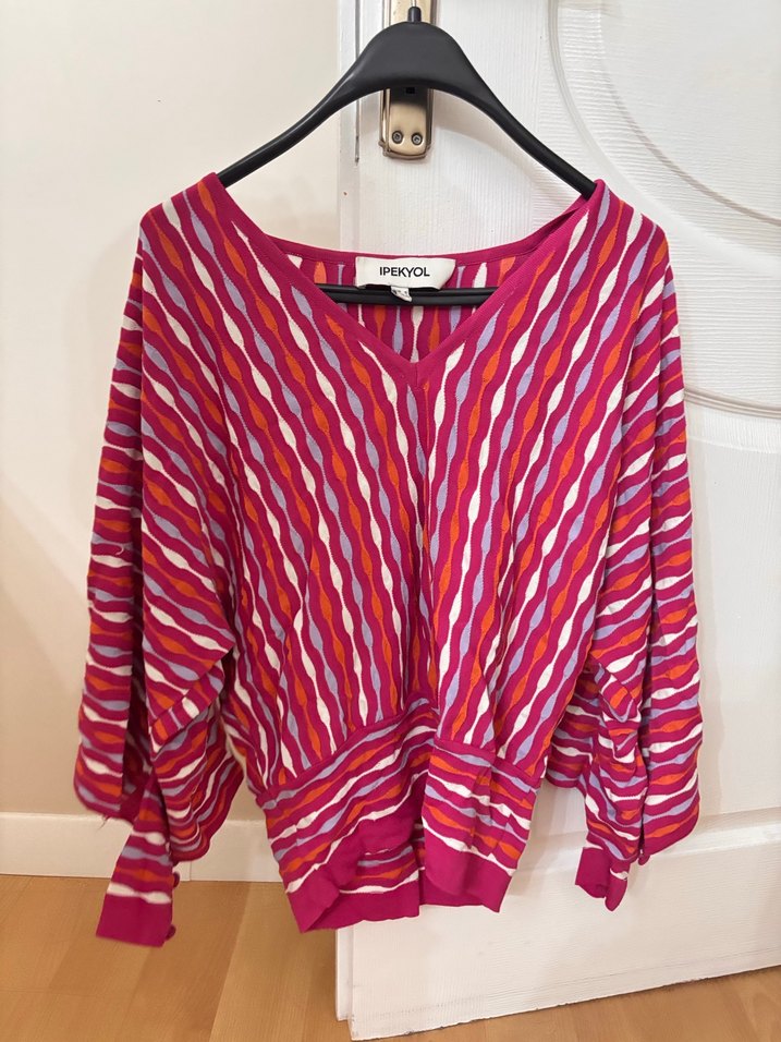 Uzun kollu, V yakalı, bol kesim kadın kazak. Renkli batik desenli, yumuşak sentetik kumaştan örülmüş, rahat ve modern bir tarz sunar. Günlük kullanım için uygundur.