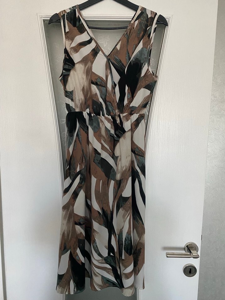 V yakalı, salaş kesim, kolsuz uzun elbise. Bej ve gri tie-dye desenli, bohem ve çağdaş tarzda. Günlük kullanıma uygundur.